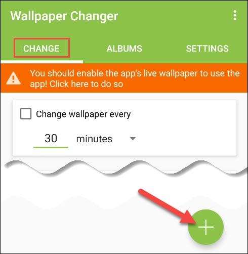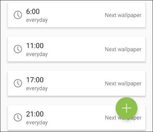 För att göra det, öppna appen på din telefon eller surfplatta och välj sedan kryssrutan bredvid alternativet "Ändra tapet varje". Tryck på rullgardinsmenyn och välj ett tidsintervall om du inte vill vara för specifik. Om du hellre skulle ställa in specifika tider trycker du på Plus-tecknet (+) längst ner till höger i fliken "Ändra".