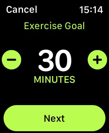 Nu kan du justera varje mål i ordning, med din Move mål. Använd Digital Crown eller knapparna på skärmen för att justera värdet för att passa. Tryck på ”Nästa” och du kommer att kunna anpassa din träning mål i 15-minutersintervall. Tryck på ”Nästa” en mer tid att justera Stand mål, i steg timme.