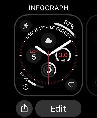 Med nuvarande urtavlan för närvarande på skärmen, peka och håll tills du ser ”Redigera” alternativet visas längst ned på skärmen. Tryck på ”Redigera” och dra över till ”Komplikationer” gränssnitt. Peka på ett fritt utrymme och rulla den digitala Crown tills du hittar Aktivitetsringen.