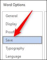 Fönstret "Word Options" visas. Klicka på fliken "Spara" i den vänstra rutan.