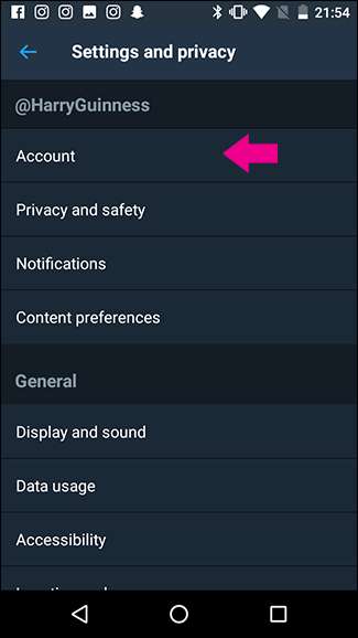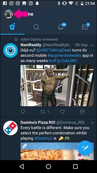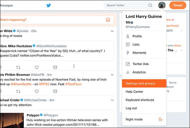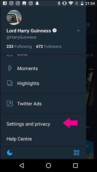 Öppna Twitter, tryck på din profilbild längst upp till höger för att öppna menyn och välj sedan Inställningar och sekretess.