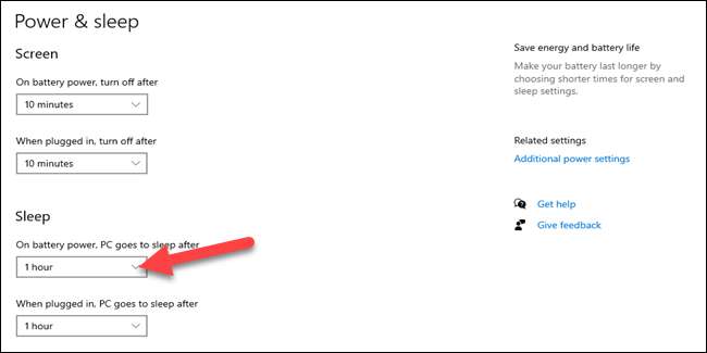 Om du använder ett skrivbord, ser du en nedrullning för "när den är inkopplad" under båda "skärmen" och "Sova". Om du använder en bärbar dator eller en tablett ser du en andra nedrullning för "på batteriet."
