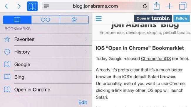 Safari-webbläsaren stöder bokmärken - små skript som kan sparas som bokmärken, men som kör ett skript på den aktuella sidan när du trycker på dem. iOS erbjuder också ett URL-schema som låter Safari starta appar från tredje part. Kort sagt är det möjligt att skapa en bokmärke som du lägger till i Safari som sedan öppnar den aktuella sidan i Google Chrome. Om du föredrar Chrome framför Safari kan du lägga till den här bokmärket i Safari. Om en app någonsin får dig att gå in i Safari när du trycker på en länk kan du trycka på bokmärket och ta den länken direkt till Chrome.