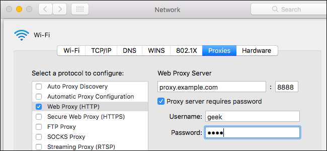 För att manuellt konfigurera en proxy måste du aktivera en eller flera av "Web Proxy (HTTP)", "Secure Web Proxy (HTTPS)", "FTP Proxy", "SOCKS Proxy", "Streaming Proxy (RTSP) ”Och” Gopher Proxy ”kryssrutorna. Ange adress och portnummer för proxyn för varje alternativ du aktiverar. Om du fick ett användarnamn och lösenord för proxyservern, aktivera alternativet "Proxyserver kräver lösenord" och ange användarnamn och lösenord.