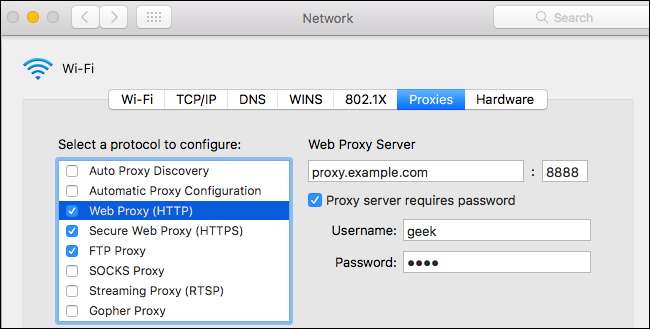 Låt oss till exempel säga att du vill konfigurera en proxy som används för HTTP-, HTTPS- och FTP-anslutningar. Du skulle markera rutorna "Web Proxy (HTTP)", "Secure Web Proxy (HTTPS)" och "FTP Proxy". När du har kontrollerat var och en anger du proxyserverns adress och port i den högra rutan. Om du vill använda samma proxyserver för alla tre anger du samma adress tre gånger. om du fick olika proxyserveradresser för olika protokoll skulle du ange olika proxyserveradresser för dessa anslutningar.