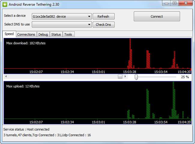 När installationen är klar kan du öppna appar på din enhet och använda Internet. Din Android vidarebefordrar nätverkstrafik via USB-kabeln till din dator, där den kommer att dra nytta av datorns internetanslutning. Windows-applikationen visar information om de vidarebefordrade anslutningarna.