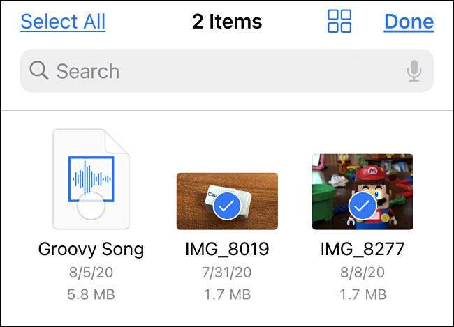 Om du vill välja flera filer på en iPhone, tryck på ellips-knappen (tre punkter i en cirkel) i det övre högra hörnet av skärmen och välj "Välj." (På en iPad, tryck bara på "Välj.") Placera sedan Markeringar på de objekt du vill kopiera till foton.