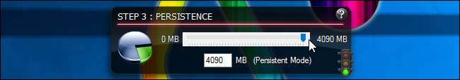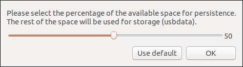 Använd alternativen i avsnittet "Steg 3: Persistens" för att välja hur mycket utrymme du vill använda för ihållande lagring på USB-enheten. Dra skjutreglaget hela vägen till höger för att välja maximal lagringsmängd.