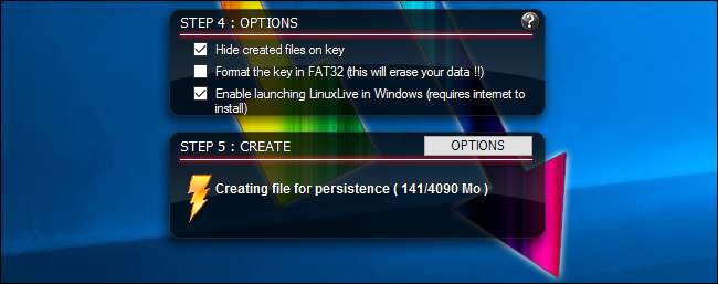 Du har nu konfigurerat alla inställningar du behöver för att konfigurera. För att skapa din USB-enhet med permanent lagring, klicka på blixtikonen under "Steg 5: Skapa".