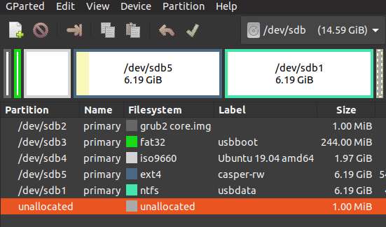 Grub-, boot- och Ubuntu-partitionerna tar mindre än 2 GB. Resten av utrymmet på USB-enheten kommer att användas för