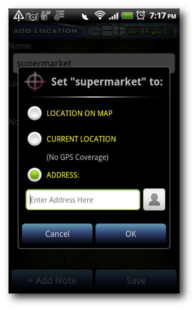 När du har fyllt i uppgiftsplatsen och adressen bör du lägga till några anteckningar och konfigurera hur GeoNote ska meddela dig om din väntande uppgift. Du kan välja att ha GeoNote för att meddela dig när du lämnar, anländer eller inom en viss tidsram på din plats.