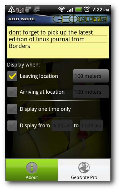 I det här exemplet ställer vi in GeoNote för att påminna oss om att hämta den senaste utgåvan av Linux Journal Magazine från Borders när vi lämnar snabbköpet i cirka 100 meter. Om du trycker på spara-knappen kommer du tillbaka till huvudskärmen och sparar din uppgift i GeoNote.