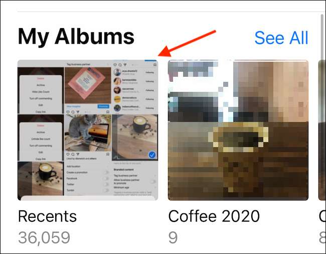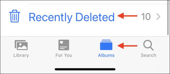 Öppna programmet Foton, tryck på fliken "Album", rulla ner och välj det "nyligen raderade" albumet.