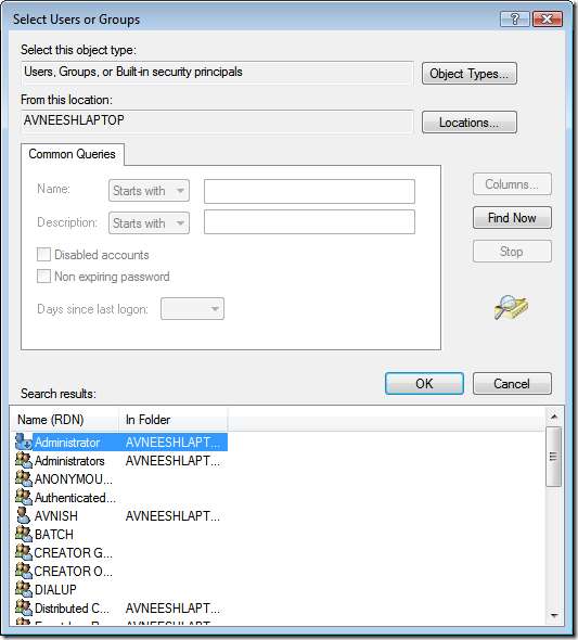 Klicka på Sök nu-knappen för att söka i alla användare och leta sedan upp användaren som du vill begränsa åtkomsten till mappen och klicka på OK. Nu ser du användarnamnet listat i fönstret Säkerhetsbehörigheter, klicka på användarnamnet för att välja.