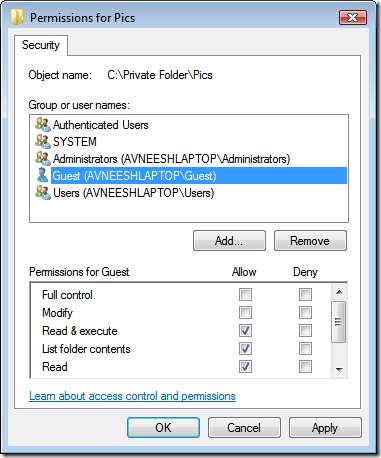 På detta sätt har du begränsat åtkomsten till mappen för en viss användare (i mitt exempel var det ett gästanvändarkonto i Vista).