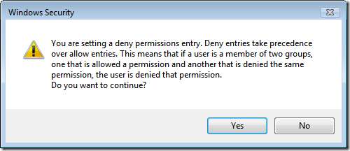 Nu kommer du att få ett Windows-säkerhetsmeddelande som kort sagt säger att neka poster alltid åsidosätter tillstånden. Klicka på Ja och sedan på OK.