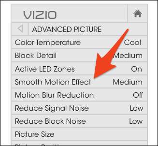 På Vizio TV: n öppnar du inställningsmenyn, väljer "Bild" och växlar sedan till fliken "Avancerad bild". Här kan du ställa in olika nivåer för "Smooth Motion Effect", som att justera hur mycket interpolering och rörelseoskärpa som appliceras. Du kan inaktivera den helt genom att ställa in den på "Av".