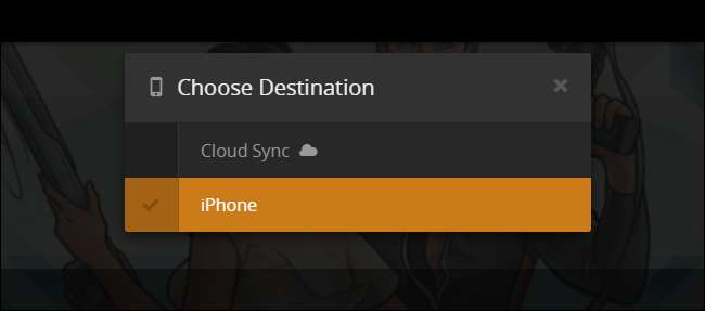 Du uppmanas att välja en destination. Destinationerna nedan är de giltiga destinationerna för vårt specifika konto. ”IPhone” är min personliga telefon och den enda enheten jag för närvarande har en mobil Plex-app installerad på. Du kan se andra alternativ som listas här som "Carls iPhone", "Tims Nexus 7" eller "Win10" beroende på vilka enheter du har Plex-appen installerad på och vad de heter. (Cloud Sync är en helt separat funktion och utformad för att synkronisera ditt innehåll till en molnbaserad lagringsleverantör. Vi ignorerar det för tillfället.)