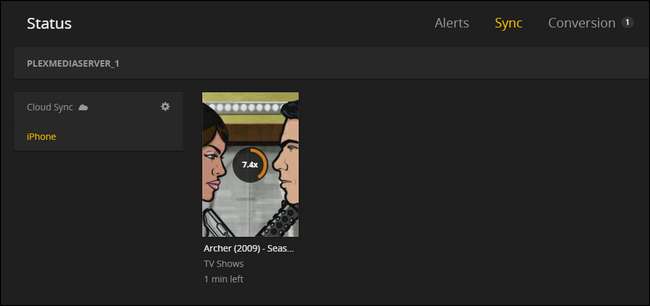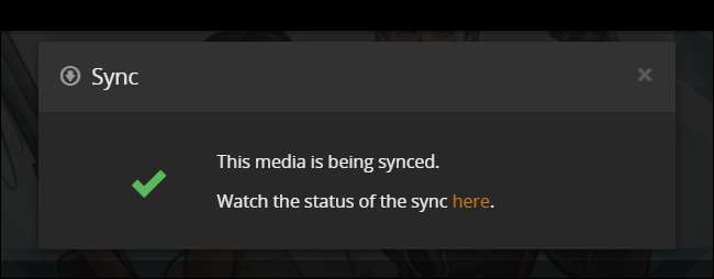 Plex meddelar att synkroniseringsprocessen har börjat. Om du klickar på länken “här” tar den dig till synkroniseringskön där du ser en allmän översikt av omkodnings- och synkroniseringsprocessen. Du kan klicka på posten för en mer detaljerad vy om du vill eller helt enkelt vänta ut det.