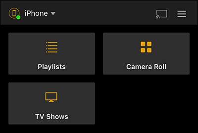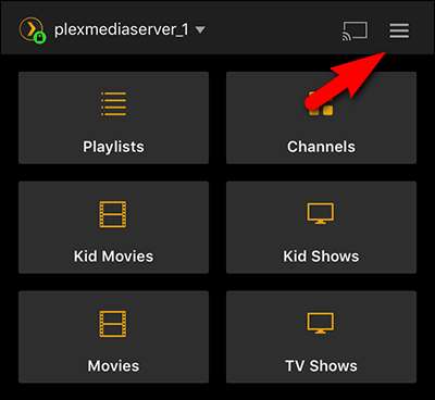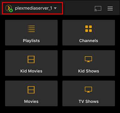 Kör programmet på din enhet - vi använder vår iPhone. Som standard kommer du att vara ansluten till din standardmediaserver (i vårt fall "plexmediaserver_1" eftersom vi helt klart har en känsla för kreativa namn). Klicka på menyknappen i hörnet.