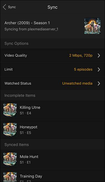 Här ser vi inte bara synkroniseringsalternativen vi ställer in på servern (som vi kan ändra här) utan också en genomgång av vilka avsnitt som redan är synkroniserade med enheten och vilka som pågår.