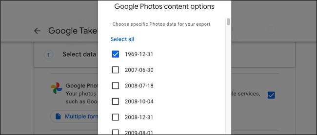 Besök Google Takeout-webbplats och logga in på ditt Google-konto. Klicka på "Avmarkera alla" -knappen för att bara exportera dina media från Google Photos och utesluta din information från resten av Google-tjänsterna.