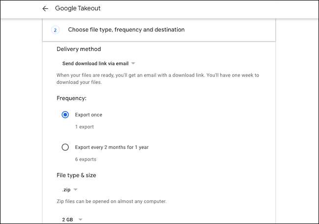 Här låter du personifiera en handfull aspekter av backup-processen. Du kan välja om du vill att Google ska spara ditt arkiv till ditt önskade molnlagring eller skicka det till dig via e-post, fråga Google för att automatiskt exportera dina foton data varje två månader och ställ in arkivfilens typ och storlek.