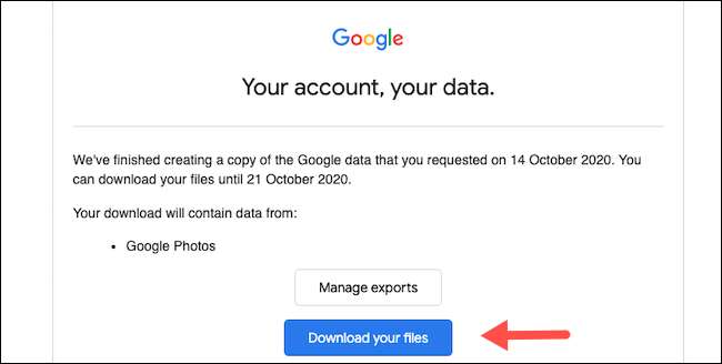 När det är klart, skickar Google ett e-postmeddelande "Dina Google-data är redo att ladda ner." Klicka på "Ladda ner dina filer" -knappen närvarande i det här e-postmeddelandet för att gå till nedladdningssidan i din arkivfil. Logga in igen med ditt Google-konto för bekräftelse.