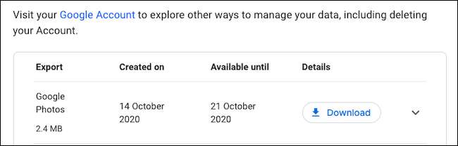 Filen ska börja ladda ner så snart du landar på följande sida "Hantera din export". Om det inte gör det, välj "Ladda ner" bredvid POTOS Export-posten i listan för att manuellt begära det. Observera att denna nedladdningslänk upphör att gälla om en vecka.