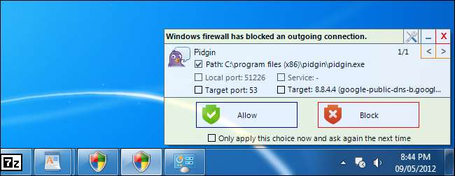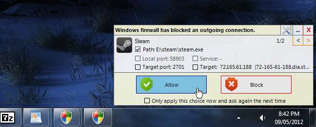 När ett program försöker ansluta nekas anslutningen och du får ett meddelande. Du kan låta applikationen ansluta eller blockera den. Som standard sparas ditt val som en brandväggsregel i Windows-brandväggen, även om du kan välja "Använd bara detta val nu och be igen nästa gång" för att tillfälligt tillåta eller blockera ett program.
