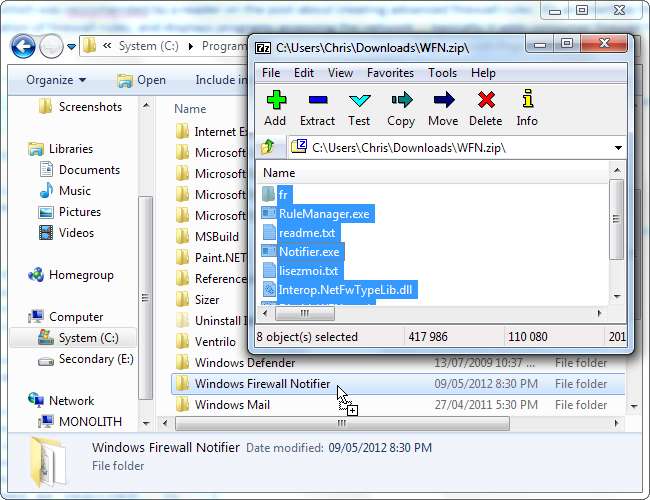 Windows Firewall Notifier innehåller inte ett installationsprogram. Efter laddar ner den måste du skapa en mapp någonstans - säg, vid C: \ Program Files \ Windows Firewall Notifier - och extrahera arkivet till den mappen.