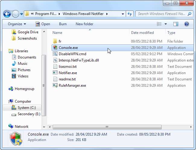Efter att ha extraherat det, starta programmet Console.exe för att aktivera Windows Firewall Notifier