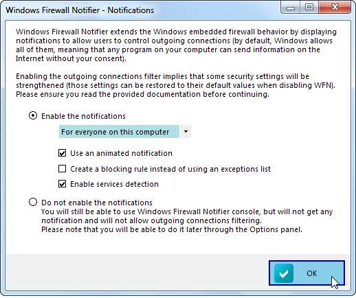 När du startar Windows Firewall Notifier, erbjuder den att aktivera utgående anslutningsaviseringar. Du måste aktivera aviseringarna för att använda Windows Firewall Notifier, även om du kan använda konsolprogrammet utan att aktivera aviseringar.