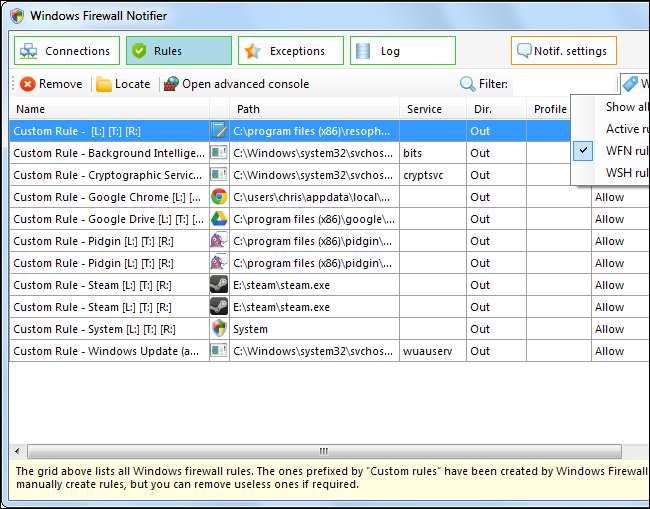 I rutan Regler kan du hantera Windows-brandväggsregler. Du kan visa regler som skapats med Windows Firewall Notifier eller visa och hantera alla dina Windows Firewall-regler.