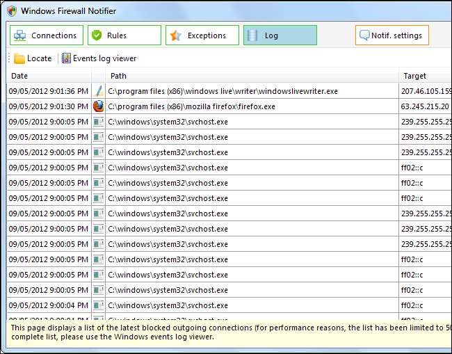 Loggfönstret visar en logg över nekade anslutningar så att du kan se vad dina blockerade program försöker göra.