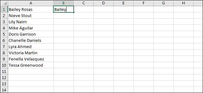 För att börja, låt oss anta att vi har en lista med namn. I kolumnen där du vill att de förnamn ska gå, skriv bara det första namnet från den första cellen.