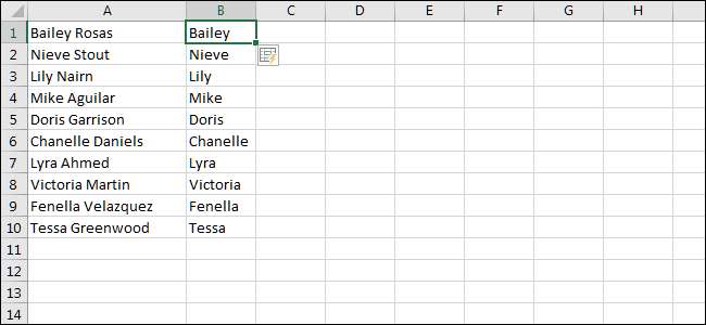Som du kan se upptäckte Excel mönstret, och blixtfyllningen fyllde resten av våra celler i den här kolumnen med endast förnamn.