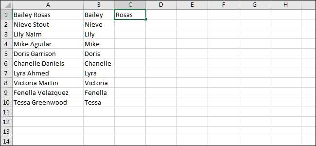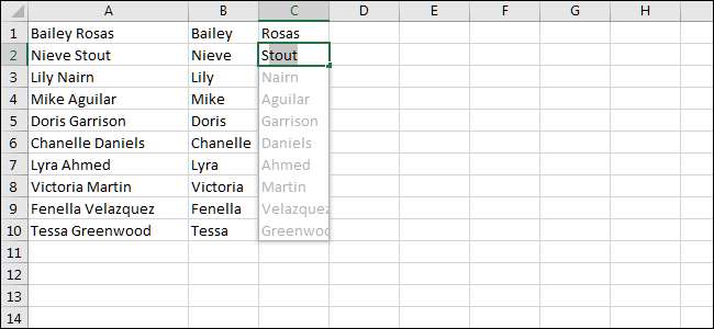 Härifrån, nu när Excel känner vårt mönster, det borde visa dig en förhandsgranskning när du skriver. Prova detta: I nästa cell över från var du skrev i förnamnet, skriv in motsvarande efternamn.