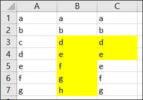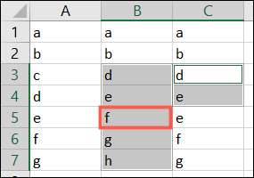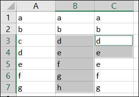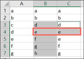 Det betyder att data i de efterföljande raderna som du ser markerade skiljer sig från den aktiva cellens kolumn. I skärmdumpen nedan kan du se att celler B4 och C4 är markerade eftersom de båda skiljer sig från A4.