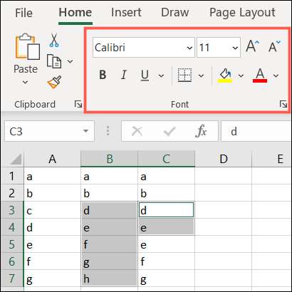 Font-sektionen på fliken Hem ger dig möjlighet att ändra texten till djärva, kursiv eller understrykning samt justera teckensnittstil, storlek och färg. Alternativt eller dessutom kan du välja en fyllningsfärg för cellerna eller Applicera en gräns .