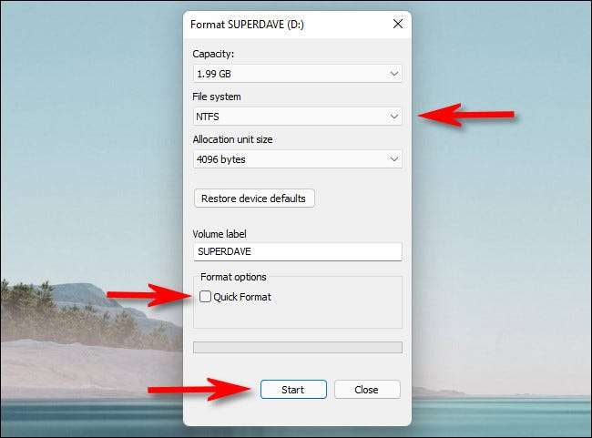 Ett "format" -fönster öppnas. Det presenterar alternativ om hur du vill formatera din enhet. Vi går över varje objekt en-för-ett så att du kan bestämma