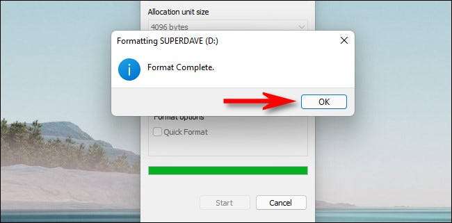 Medan Windows formaterar skivan ser du en grön processindikator flyttas från vänster till höger. När det är helt fullt kommer formatet att vara klart, och du ser en popup-upp. Klicka på "OK".