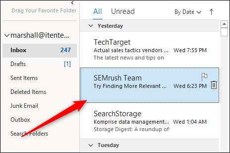 För att göra det, starta "Outlook" och välj sedan det e-postmeddelande du vill vidarebefordra som en bilaga genom att klicka på den i listan E-post.