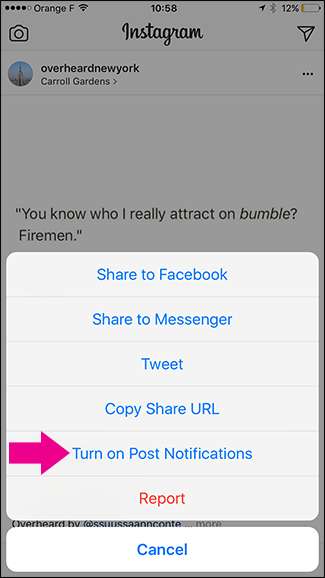 När du bläddrar igenom ditt flöde, om du ser ett inlägg från personen du vill ha aviseringar för, tryck på de tre punkterna i det övre högra hörnet och tryck sedan på Aktivera inläggaviseringar.
