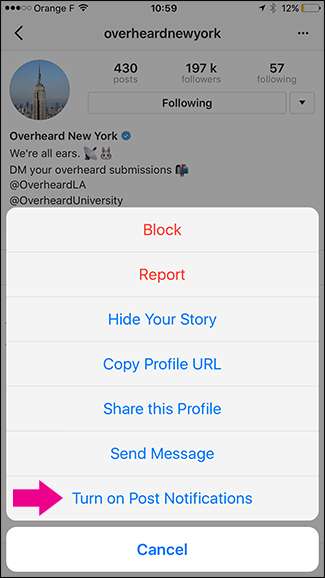 Du kan också aktivera aviseringar från deras profilsida. Tryck än en gång på de tre punkterna längst upp till höger och tryck sedan på Aktivera inläggsmeddelanden.