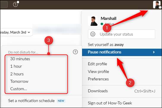 I Slack, till exempel genom att klicka bara din profilikon i det övre högra hörnet av skärmen och muspekaren över Pause Notifications. Klicka sedan hur lång tid du vill pausa aviseringar i stör ej-gruppen.
