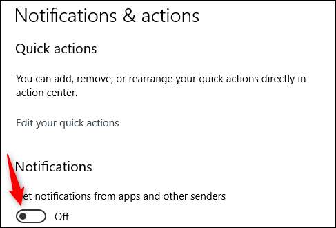 Du kommer nu att i meddelande & amp; Fönstret Åtgärder i appen Inställningar. Under ”Get meddelanden från appar och andra avsändare” inställning i meddelandegruppen, växla reglaget åt vänster. Detta stänger av alla meddelanden.