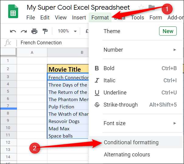 Markera alla celler i tabellen och klicka sedan på Format> Villkorlig formatering från verktygsfältet.