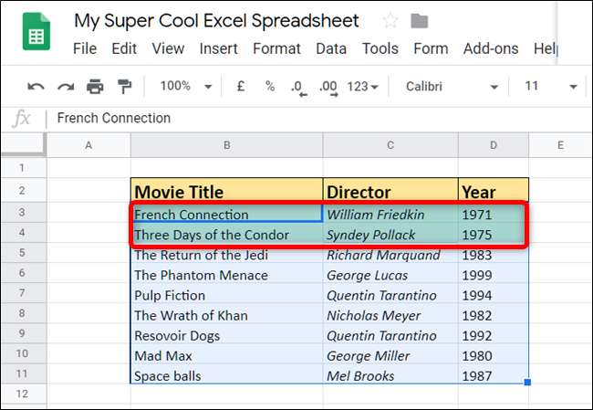 Och precis så, markeras raderna med filmer som släpptes före 1980 i grönt.