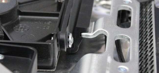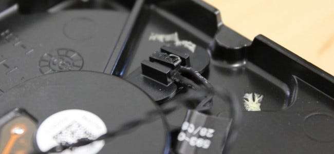 Hårddisken hålls på plats med ett starkt klipp, och det tar en ganska stor mängd kraft att ta bort den. Du måste trycka ned och in på klippet för att lossa det, dra sedan uppåt och mot dig för att ta bort hårddisken.